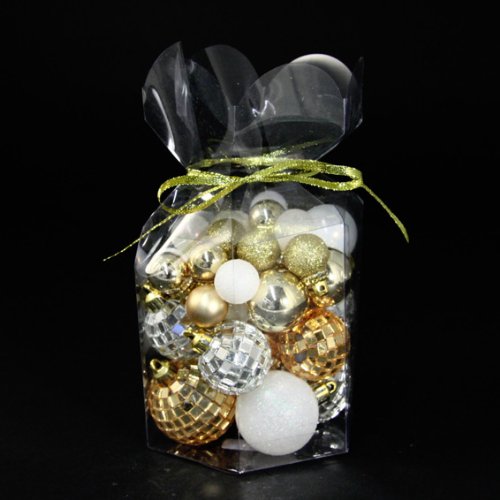 #Ce kit contient 35 décorations de table. 18 boules de 20 mm, 13 boules de 30 mm, 4 boules de 40 mm. Couleur: or et blanc.